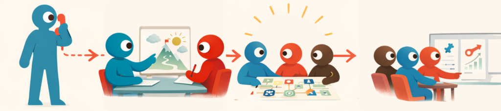 Ik spreek met sleutelpersonen en ontwerp een sessie die focust op besluitvorming, niet op meningen verzamelen.